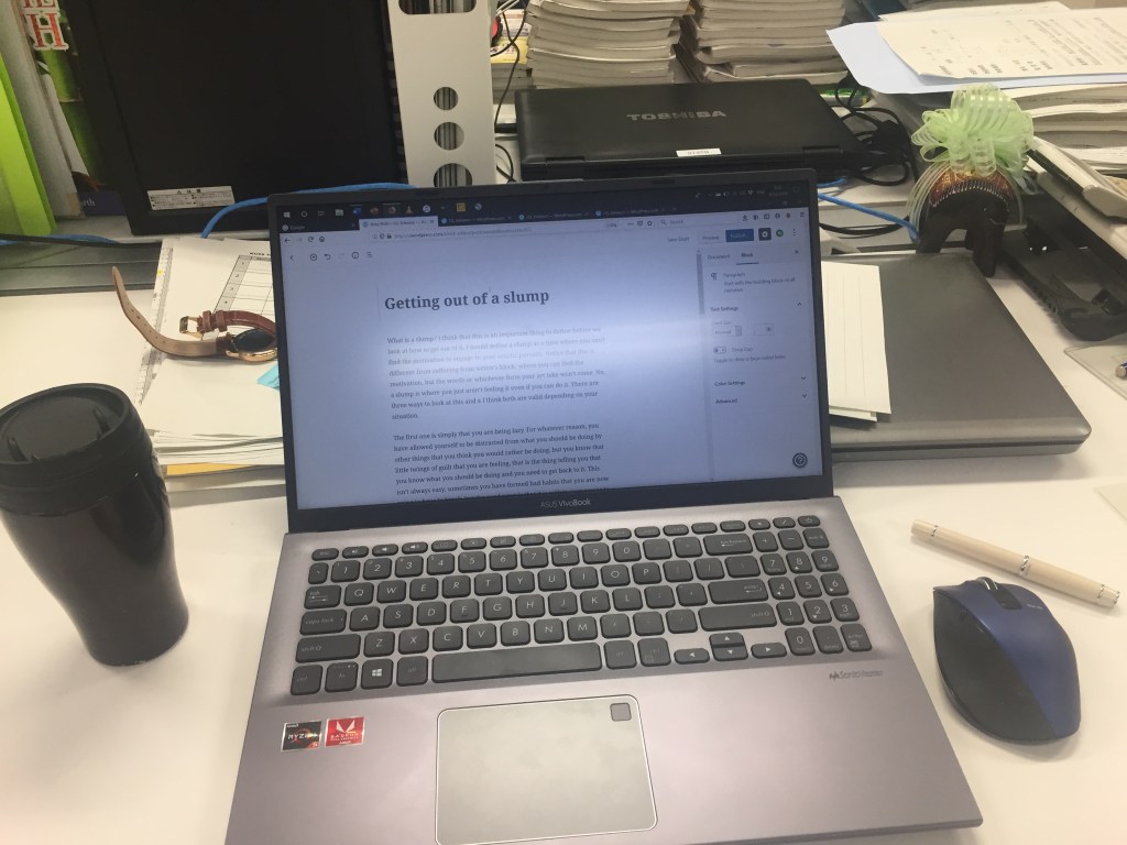 What is a slump? I think that this is an important thing to define before we look at how to get out of it. I would define a slump as a time where you can’t find the motivation to engage in your artistic pursuits. Notice that this is different from suffering from writer’s block; where you can find the motivation, but the words or whichever form your art take won’t come. No, a slump is where you just aren’t feeling it even if you can do it. There are three ways to look at this and a I think both are valid depending on your situation.